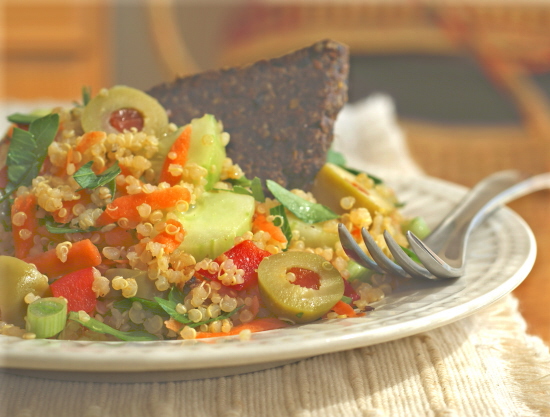 In keeping with my salad contest, I found this Quinoa Salad recipe. Actually, it is three recipes in one: Quinoa Salad, Salad Dressing, and Black Olive Shortbread! The author has created a wonderful meal with just one post!